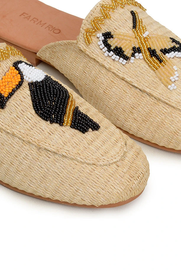 Walk in Happiness! The Toucan Raffia Mule features a straw upper with embroidered beads and a rubber sole with vegan leather. Your FARM Rio Shoes match pretty much everything you have in your timeless wardrobe, from dresses to jumpsuits to pants (and all in between!).