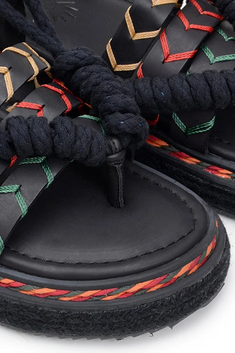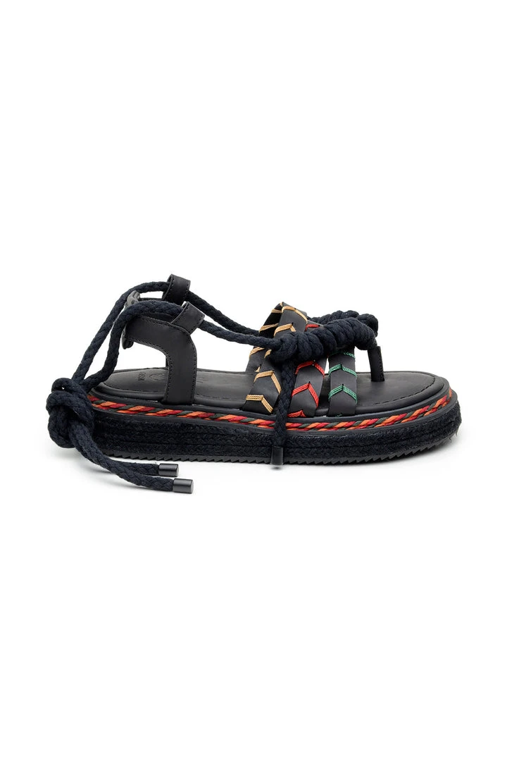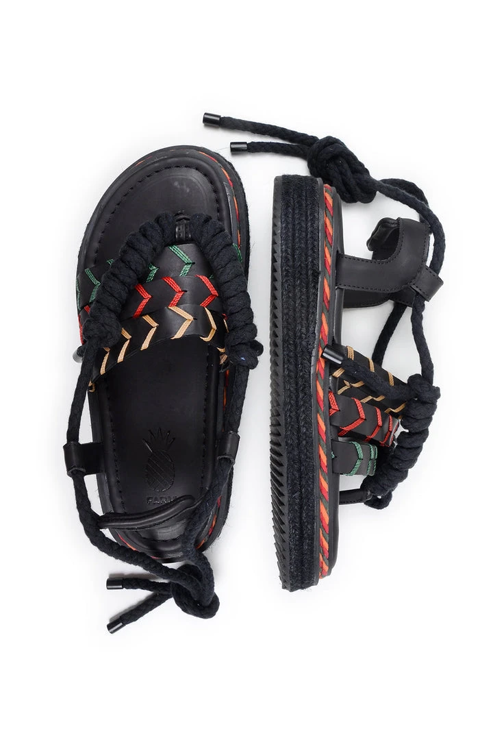 Walk in Happiness! The Black Rope Tie Flatform Sandal features a vegan leather upper, cotton ropes with wood tassels, and a rubber sole with cotton ropes, jute, and vegan leather. Your FARM Rio Shoes match pretty much everything you have in your timeless wardrobe, from dresses to jumpsuits to pants (and all in between!).