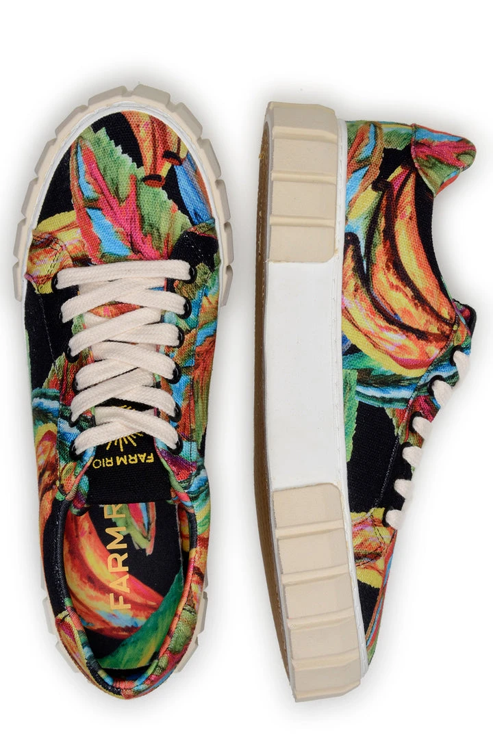 Walk in Happiness! The Black Rainbow Bananas Flatform Sneaker features a printed cotton upper and a rubber sole. Your FARM Rio Shoes match pretty much everything you have in your timeless wardrobe, from dresses to jumpsuits to pants (and all in between!).